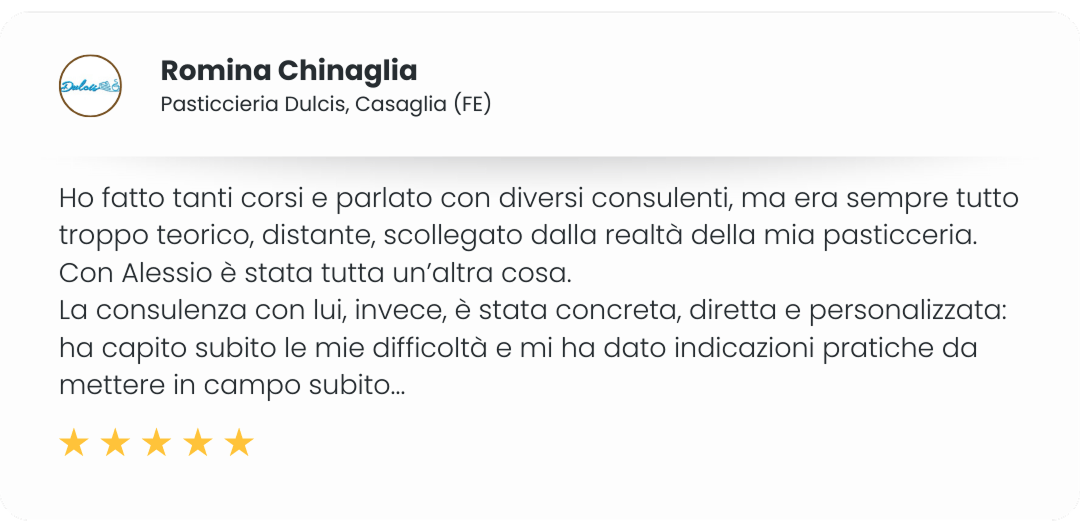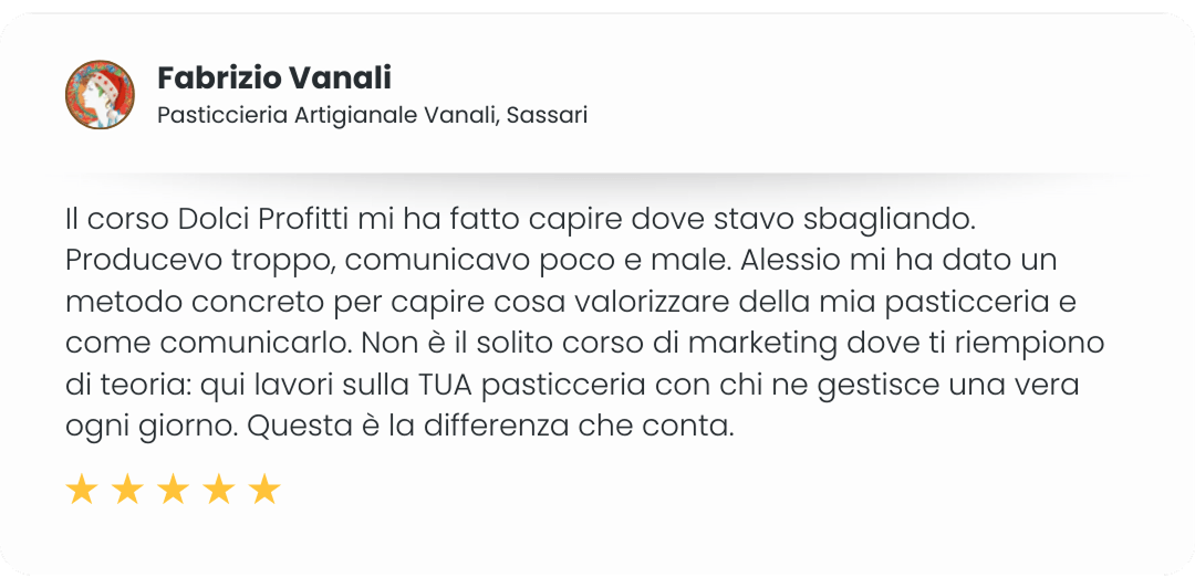 Mentre le agenzie ti vendono "tecniche di marketing generiche", io so esattamente cosa funziona nel settore dolciario. Perché lo applico ogni giorno nella mia pasticceria. Conosco i margini... Le dinamiche con i dipendenti... E tutto ciò che serve per far crescere davvero un'attività nel nostro settore.